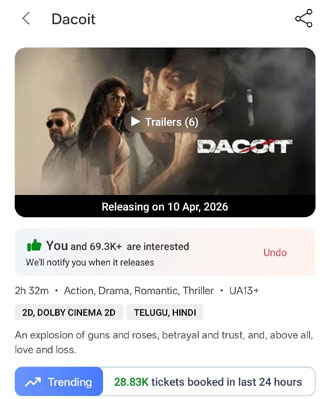 Starting at 8 AM tomorrow, the romantic revenge thriller Dacoit, starring Adivi Sesh and Mrunal Thakur, officially hits theaters. Expectations are soaring for this film, which marks the directorial debut of Shaneil Deo.