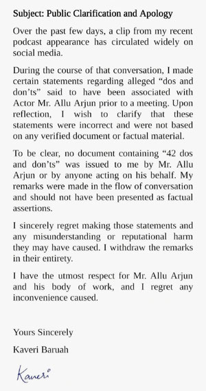 She clarified that no such official list of rules was given to her by Allu Arjun or his team and expressed regret if her comments caused damage to the actor’s reputation. Kaveri added that she respects Allu Arjun and his work and apologized for the inconvenience caused.