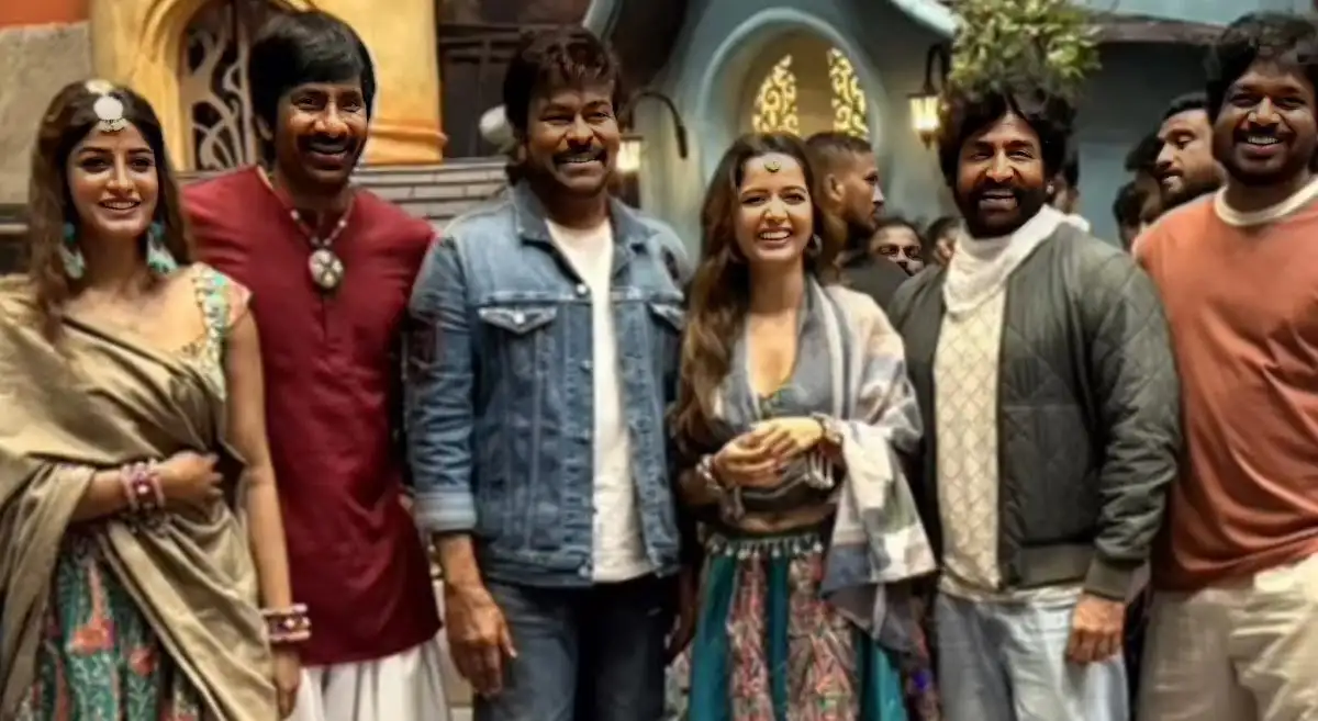 Chiranjeevi’s unexpected visit left Ravi Teja and the entire unit thrilled, as the megastar interacted warmly with the cast and crew and wished them the very best for the film.