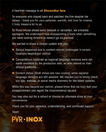 PVR Cinemas also appreciated the patience, warmth, and love shown by audiences towards cinema and assured that efforts are being made to enhance the overall experience going forward. Screenings of the regional language versions are expected to begin mostly from tomorrow.
