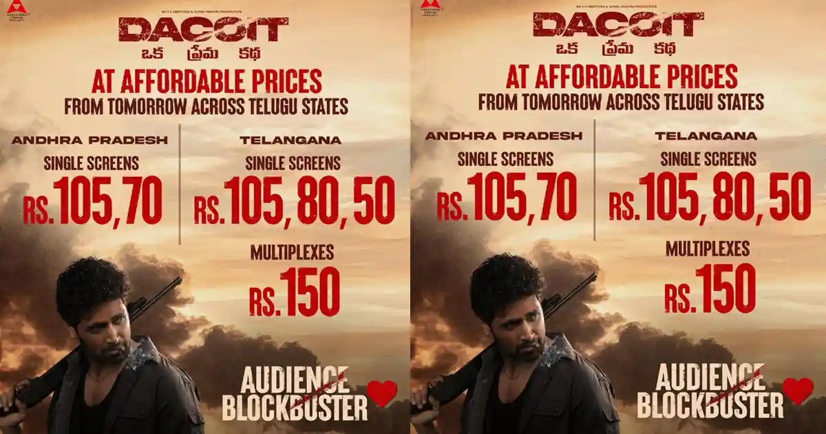 Starting today, the makers have introduced affordable ticket prices for Dacoit starting today. For single screens, the price is Rs. 70 and Rs. 105 in Andhra Pradesh, and Rs. 50, Rs. 80, and Rs. 105 in Telangana. For multiplexes in Hyderabad, the ticket price is Rs. 150. This is a significant price reduction for those who want to catch up on the film.