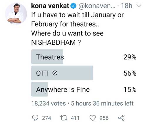 Yesterday, writer and producer, Kona Venkat put up a poll on Twitter asking the audience as to where they would love to see his upcoming film Nishabdham starring Anushka.