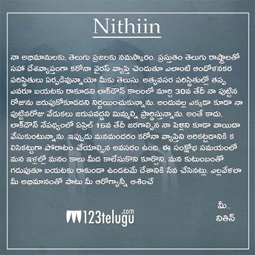 Incidentally, Nithiin has also urged his fans to not celebrate his birthday tomorrow and that they should stay indoors and follow all guidelines during the lockdown.