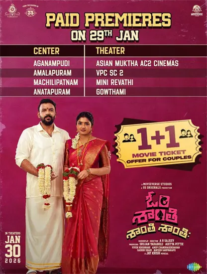 They have announced a 1+1 special offer for couples in select theatres in Andhra Pradesh. This special offer is applicable to paid premiere shows scheduled for January 29, 2026. The list of theatres in Telangana is expected to be announced soon.
