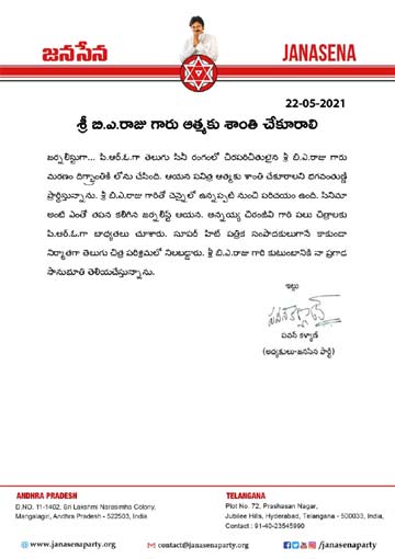 Hero Pawan Kalyan’s political outfit Janasena Party’s Twitter handle released Pawan’s condolence message yesterday evening. In his message, Pawan said that he has had a long-time association with BA Raju from the time when the Telugu film industry was based in Madras.