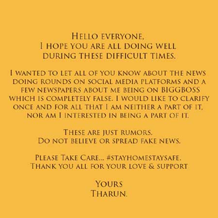 Tharun clarified that he is neither taking part in Bigg Boss nor he is interested in being part of the show. He further requested everyone to not spread fake news and urged everyone to stay home and stay safe in these hard times amid the Coronavirus pandemic.