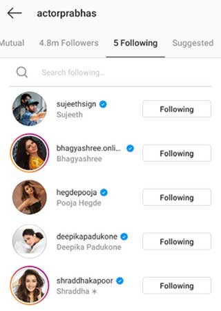Having close to five million followers on his official Instagram, Prabhas is only following five members in return. The following list includes Prabhas 21 female lead Deepika Padukone, Radhe Shayam fame Pooja Hedge, Saaho girl Shraddha Das, young director Sujeeth, and yesteryear heroine Bhagya Shree.
