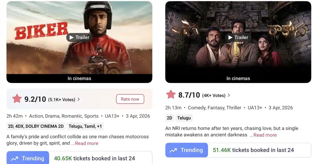 Two Telugu films, Biker and Raakaasaa, released this Friday, offering contrasting genres to audiences. While Biker is a serious sports drama, Raakaasaa comes as a comedy horror entertainer. Both films opened with positive word of mouth.