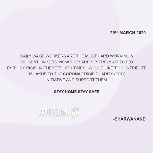 Earlier today, Sharwa announced that he is donating Rs 15 lakhs to the Corona Crisis Charity (CCC) fund which has been set up by the Telugu film industry. The CCC takes care of the daily wage workers who are severely affected by this crisis.