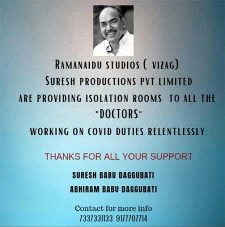 As per latest updates, Rama Naidu Studios, Vizag operated by Suresh Productions have taken an appreciable decision as they are now providing isolation rooms to all the doctors who are working on Covid duties. Those in need can get in touch with the contact numbers mentioned below.
