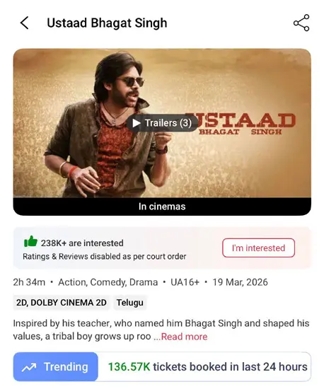 On its second day, the Pawan Kalyan starrer managed to sell 136.57K tickets on the ticketing platform. So far, the movie has sold 850K tickets on BookMyShow (including pre-sales), and is expected to touch the 1 million mark by this weekend.