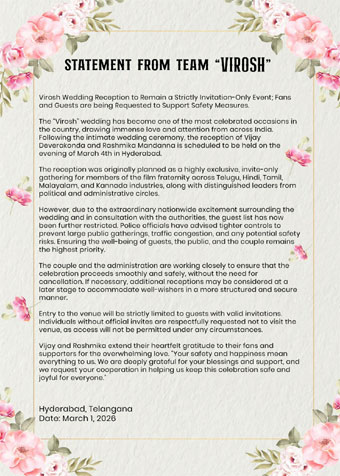 The decision was reportedly taken to avoid mishaps and major traffic disruptions in Hyderabad. The couple expressed gratitude for the love and support while urging fans to cooperate and bless them from afar.