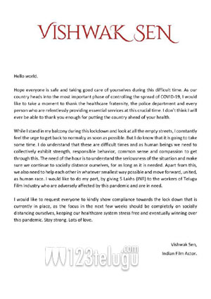 Young hero Vishwak Sen has come forward and contributed Rs 5 lakhs to the Corona Crisis Charity fund. In a press note, Vishwak thanked the healthcare fraternity, the police department and each and every person who is relentlessly providing essential services at this crucial time.