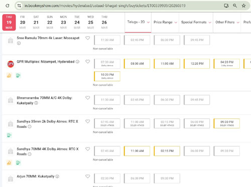 A few theatres have already registered sold-outs, while many others are fast filling. Bookings in national chains like PVR-Inox and Cinepolis are set to open soon, as informed by the makers. The film, directed by Harish Shankar, will have early morning shows starting at 7:30 AM in Telangana.