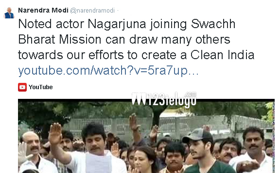 ‘స్వచ్ఛ భారత్ అభియాన్’ కార్యక్రమంలో పాల్గొన్నందుకు నరేంద్రమోదీ ట్విట్టర్ ద్వారా హీరో నాగార్జునకు అభినందనలు తెలిపారు. ‘ప్రముఖ తెలుగు నటుడు నాగార్జున స్వచ్ఛ భారత్ మిషన్ లో పాల్గొన్నారు. క్లీన్ ఇండియా సాధన కోసం మనం చేస్తున్న ప్రయత్నాల వైపు ఇతరులలో స్ఫూర్తి కలిగిస్తుంది.’ అని మోడీ ట్వీట్ చేశారు.