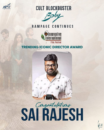 అయితే ఇలాంటి చిత్రాన్ని అందించిన దర్శకుడు సాయి రాజేష్ కి అయితే లేటెస్ట్ గా ఓ అవార్డు దక్కింది. రీసెంట్ గా జరిగిన ఇనోవేటివ్ ఇంటర్నేషనల్ ఫిల్మ్ ఫెస్టివల్ లో అయితే ట్రెండింగ్ ఐకానిక్ దర్శకునిగా సాయి రాజేష్ అవార్డు దక్కించుకున్నాడు. దీనితో బేబి అవార్డ్స్ హంట్ స్టార్ట్ అయ్యింది అని చెప్పాలి. ఇక ఈ చిత్రానికి విజయ్ బుల్గానిన్ బ్యూటిఫుల్ చార్ట్ బస్టర్ ఆల్బమ్ ని అందించగా ఎస్ కే ఎన్ నిర్మాణం వహించారు.