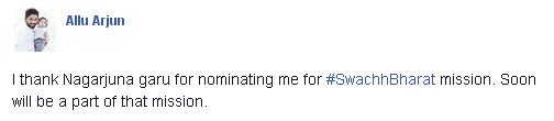 ‘స్వచ్ఛ భారత్ కార్యక్రమానికి నన్ను నామినేట్ చేసినందుకు నాగార్జున గారికి థాంక్స్. త్వరలో స్వచ్ఛ భారత్ మిషన్ లో పోల్గొంటాను’ అని సోషల్ మీడియాలో అల్లు అర్జున్ పేర్కొన్నారు.