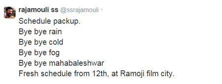 ‘షెడ్యూల్ పాకప్.. బై బై వర్షం, బై బై చలి, బై బై మంచు, బై బై మహా బలేశ్వర్.. న్యూ షెడ్యూల్ సెప్టెంబర్ 12 నుంచి రామోజీ ఫిల్మ్ సిటీలో మొదలవుతుందని’ ఎస్ఎస్ రాజమౌళి ట్వీట్ కూడా చేసారు. ప్రభాస్, రానా అన్నదమ్ములుగా కనిపించనున్న ఈ సినిమాలో అనుష్క, తమన్నా హీరోయిన్స్ గా నటిస్తున్నారు. ఎంఎం కీరవాణి సంగీతం అందిస్తున్న ఈ సినిమా రెండు పార్ట్స్ గా ప్రేక్షకుల ముందుకు రానుంది. అందులో మొదటి పార్ట్ ని 2015 ఏప్రిల్ లో రిలీజ్ చెయ్యడానికి ప్లాన్ చేస్తున్నారు..