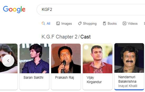 కన్నడ రాకింగ్ స్టార్ యశ్ హీరోగా షార్ప్ డైరెక్టర్ ప్రశాంత్ నీల్ నుంచి కేజీఎఫ్ సీక్వెల్ రాబోతున్న సంగతి తెలిసిందే. అయితే ఈ సినిమాలో బాలయ్య బాబు నటించబోతున్నాడు అంటూ గూగుల్ చూపిస్తుండటం ఆశ్చర్యం కలిగిస్తోంది. గూగుల్‌ సెర్చ్‌లో ‘కేజీఎఫ్‌2’ అని వెతికితే ఆ సినిమాలో నటీనటుల జాబితాలో బాలయ్య బాబు పేరు కూడా ఉంది. పైగా బాలయ్య పోషించబోయే పాత్ర పేరు ‘ఇనాయత్‌ ఖలీల్‌’ అని కూడా ఉంది. కానీ ఈ వార్తలో ఎలాంటి నిజం లేదు.
