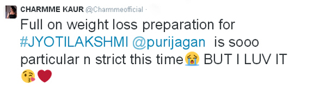 దర్శకుడు పూరి జగన్నాధ్ ఆదేశాల మేరకు ప్రస్తుతం చార్మీ బరువు తగ్గే పనిలో బిజీగా ఉంది. స్ట్రిక్ట్ డైట్ మైంటైన్ చేస్తుంది. ఉడికించిన కాయగూరలు, కొద్దిపాటి మిత ఆహారం తీసుకుంది. ఈ ప్రాసెస్ ను లవ్ చేస్తున్నాని చార్మీ చెప్పింది. తనకు ఇష్టమైన ఆహారం తినకుండా నోరు కుట్టేసుకుంది. ‘జ్యోతిలక్ష్మి’లో తన పాత్ర అద్బుతంగా రావడం కోసం చార్మీ ఫుడ్ త్యాగం చేస్తుందనమాట .