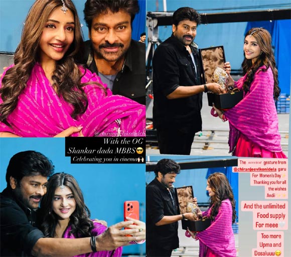 మహిళా దినోత్సవం సందర్భంగా తనను కలిసిన శ్రీలీలకు శాలువా కప్పి సత్కరించిన దుర్గాదేవి రూపం ముద్రించిన శంఖాన్ని బహుమతిగా బహుకరించారు మెగా స్టార్ చిరంజీవి గారు. మెగాస్టార్ నుంచి వచ్చిన ఈ ప్రత్యేకమైన బహుమతిని అందుకున్న శ్రీలీల సంతోషాన్ని వ్యక్తం చేస్తూ ఫొటోలను తన సోషల్ మీడియా అకౌంట్లో పోస్ట్ చేశారు. దీనితో ఈ బ్యూటిఫుల్ మూమెంట్ వైరల్ గా మారింది.