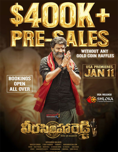 నందమూరి నటసింహం నందమూరి బాలకృష్ణ హీరోగా శృతి హాసన్ హీరోయిన్ గా నటించిన లేటెస్ట్ అవైటెడ్ మాస్ చిత్రం “వీరసింహా రెడ్డి”. భారీ అంచనాలు ఉన్న ఈ చిత్రం అయితే రిలీజ్ కి దగ్గర అవుతుండగా యూఎస్ మార్కెట్ లో అయితే ఈ చిత్రం మాసివ్ రెస్పాన్స్ తో దూసుకెళ్తుంది. మరి లేటెస్ట్ గా అయితే ఈ చిత్రం అక్కడ ఏకంగా 4 లక్షల డాలర్స్ మార్క్ ని దాటేసింది.