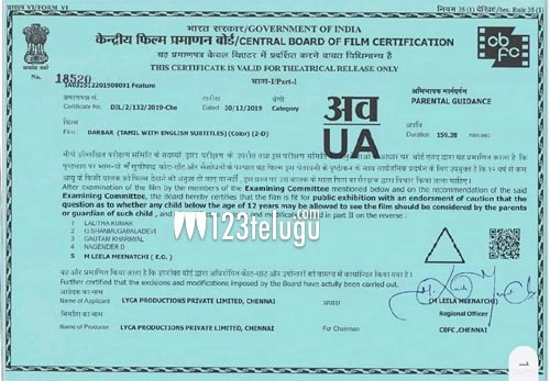 రజిని కాంత్ హీరోగా నటిస్తున్న లేటెస్ట్ మూవీ దర్బార్. దర్శకుడు మురుగదాస్ తెరకెక్కించిన ఈ చిత్రం సంక్రాంతి కానుకగా జనవరి 9న విడుదల కానుంది. కాగా తాజాగా ఈ సినిమా సెన్సార్ కార్యక్రమాలను కూడా పూర్తి చేసుకుంది. ‘U/A ‘ సర్టిఫైతో భారీ స్థాయిలో ప్రపంచ వ్యాప్తంగా ప్రేక్షకుల ముందుకు రావ్వడానికి సన్నధం అవుతుంది. ఈ చిత్రం యొక్క రన్ టైమ్ 2 గంటల 39 నిమిషాల అని తెలుస్తోంది.