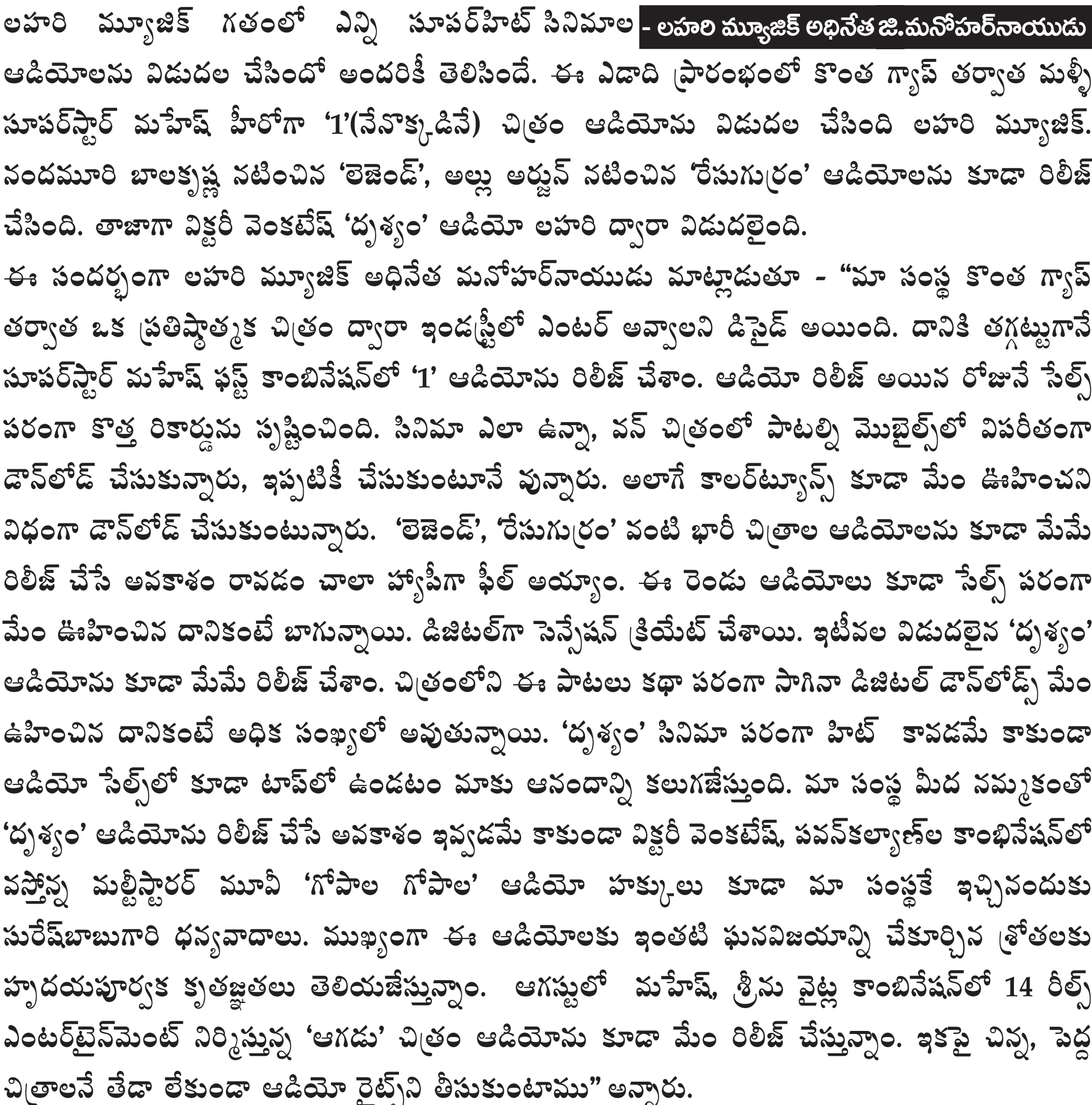 ఆడియో పరంగా సెన్సేషన్ క్రియేట్ చేస్తున్న ‘దృశ్యం’