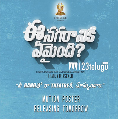 మొదటి సినిమా ‘పెళ్లి చూపులు’తో భారీ సక్సెస్ అందుకుని అందరి దృష్టినీ ఆకట్టుకున్న దర్శకుడు తరుణ్ భాస్కర్ ప్రస్తుతం తన రెండవ ప్రాజెక్ట్ ‘ఈ నగరానికి ఏమైంది’ చిత్రాన్ని విడుదలకు సిద్ధం చేస్తున్నారు. ఫస్ట్ లుక్ పోస్టర్ మీద ‘నీ గ్యాంగ్ తో రా థియేటర్ కి, చూస్కుందాం’ అంటూ ఆసక్తిని రేకెత్తించిన ఆయన రేపు మోషన్ పోస్టర్ తో మన ముందుకురానున్నారు.