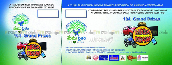 తెలుగు చలన చిత్ర పరిశ్రమ హుదూద్ బాధితుల కోసం చేస్తున్న కార్యక్రమం ‘మేముసైతం – వుయ్ లవ్ వైజాగ్’. నవంబర్ 30న జరగనున్న ఈ వేడుక 10 కోట్ల రూపాయల మొత్తాన్ని వసూలు చేసి ఎపి సిఎం రిలీజ్ ఫండ్ కి ఇవ్వాలని ప్రయత్నిస్తున్నారు. అందులో భాగంగా పలు కార్యక్రమాలను నిర్వహిస్తున్నారు. ఇప్పటికే స్టార్ నైట్ డిన్నర్, స్టార్స్ క్రికెట్ మ్యాచ్ మరియు టెలీ థాన్ ప్రోగ్రామ్స్ కి రంగం సిద్దం చేస్తున్నారు. ఇది పక్కన పెడితే తాజాగా ఓ ప్రేక్షకుల కోసం ‘బంపర్ మెగా డ్రా’ని నిర్వహించారు.