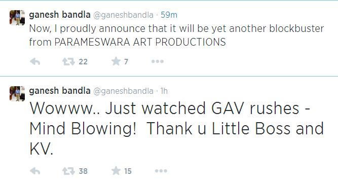 ఈ సినిమా కూడా తన కెరీర్లో మరో బ్లాక్ బస్టర్ అవుతుందని బండ్ల గణేష్ గట్టిగా చెబుతున్నాడు. ‘ఇప్పుడే ‘గోవిందుడు అందరివాడేలే’ రషెస్ చూసాను. సూపర్బ్ గా ఉన్నాయి. మా లిటిల్ స్టార్ మరియు కృష్ణవంశీకి నా థాంక్స్. ఇవి చూసాక నా పరమేశ్వర ఆర్ట్ ప్రొడక్షన్స్ లో మరో బ్లాక్ బస్టర్ రానుందని గర్వంగా అనౌన్స్ చేస్తున్నానని’ బండ్ల గణేష్ ట్వీట్ చేసాడు.