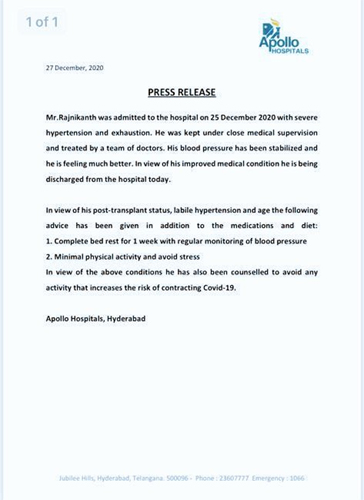 తమిళ సూపర్ స్టార్ రజినీకాంత్ ఇటీవలే కాస్త అనారోగ్యంతో తన సినిమా షూట్ నుంచే హైదరాబాద్ లోని అపోలో హాస్పిటల్ లో అడ్మిట్ అయిన సంగతి తెలిసిందే. బీపీ లోని హెచ్చు తగ్గులతో గత మూడు రోజుల నుంచి చికిత్స పొందుతున్న తలైవర్ త్వరగా కోలుకోవాలని అంతా కోరుకున్నారు.