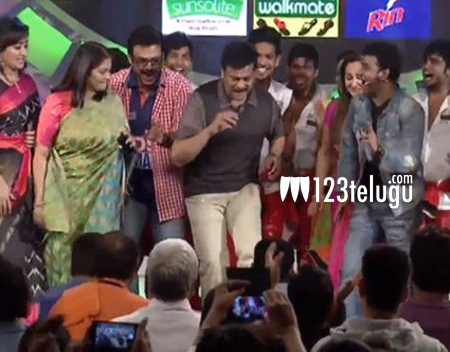 ‘శంకర్ దాదా జిందాబాద్’ సినిమాలో పాటకు మెగాస్టార్ చిరంజీవి వేసిన స్టెప్పులు ‘మేము సైతం’ కార్యక్రమానికి హైలైట్ గా నిలిచింది. రాజకీయాలలోకి వెళ్ళిన తర్వాత మెగాస్టార్ ముఖానికి మేకప్ వేసుకోలేదు. సుమారు ఏడేళ్ళ తర్వాత 150వ సినిమా చేయడానికి సన్నద్ధం అవుతున్నారు. ఇటీవల స్లిమ్ గా, గ్లామరస్ గా తయ్యారయ్యారు. మళ్లీ మునుపటి మెగాస్టార్ మనకు కనిపించారు. దేవి శ్రీ ప్రసాద్ స్టేజి పెర్ఫార్మన్స్ ఇస్తున్న సమయంలో వెంకి, రవితేజ చిరుని వేదికపైకి తీసుకొచ్చారు. వద్దు వద్దు అంటూనే శంకర్ దాదా స్టెప్పులు వేశారు.