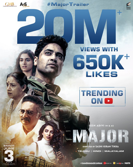 అడివి శేష్ ప్రధాన పాత్రలో శశి కిరణ్ తిక్క దర్శకత్వం లో తెరకెక్కుతున్న చిత్రం మేజర్. మేజర్ సందీప్ ఉన్ని కృష్ణన్ నిజ జీవిత సంఘటనల ఆధారంగా మేకర్స్ ఈ చిత్రాన్ని తెరకెక్కిస్తున్నారు. ఈ చిత్రం నుండి విడుదల అయిన ప్రచార చిత్రాలకి సూపర్ రెస్పాన్స్ రాగా, చిత్ర యూనిట్ ట్రైలర్ ను పలు హిందీ, తెలుగు, మలయాళ భాషల్లో విడుదల చేసిన సంగతి తెలిసిందే. ఈ ట్రైలర్ కి భారీ రెస్పాన్స్ వస్తోంది. ఇప్పటి వరకూ ఈ ట్రైలర్ కి 20 మిలియన్స్ కి పైగా వ్యూస్ రావడం విశేషం. అంతేకాక 650కే కి పైగా లైక్స్ తో ఈ ట్రైలర్ యూ ట్యూబ్ లో టాప్ లో ట్రెండ్ అవుతోంది.