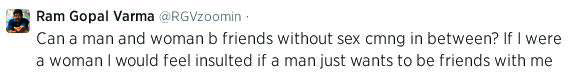 ‘ ఒక అమ్మాయి, ఒక అబ్బాయి మధ్య శృంగారం(సెక్స్) లేకుండా స్నేహితులుగా ఉండగలరా..? ఒకవేళ నేను అమ్మాయి అయితే ఎవరైనా అబ్బాయి శృంగారం ఆశించకుండా కేవలం నాతో స్నేహం(ఫ్రెండ్షిప్) చేయాలని అనుకుంటే నాకు చాలా అవమానం జరిగినట్టు భావిస్తాను. ‘ అని సోషల్ మీడియాలో రామ్ గోపాల్ వర్మ వ్యాఖ్యానించారు.
