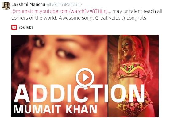 ఇండో అమెరికన్ స్లాంగ్ లో ముమైత్ ఖాన్ పాడిన ఈ ‘ఎడిక్షన్’ సాంగ్ ప్రేక్షకులను అలరిస్తుంది. పాత రోజులను గుర్తు తెస్తూ బికినీ, నైట్ వేర్ డ్రెస్సులలో ముమైత్ డాన్సు చేసింది. ఈ పాట చూసిన మంచు లక్ష్మి ముమైత్ ఖాన్ పై ప్రసంశలు కురిపించింది. ‘నీ పాట ప్రపంచం నలుమూలలు చేరుతుందని ఆశిస్తున్నాను. ఆసమ్ సాంగ్. గ్రేట్ వాయిస్’ అంటూ ట్విట్టర్లో పోస్ట్ చేశారు మంచు లక్ష్మి. ఈ పాటతో తనకు తిరిగి అవకాశాలు వస్తాయని మాజీ ఐటెం భామ ఆశిస్తుంది. తన కోరిక నెరవేరాలని కోరుకుందాం.