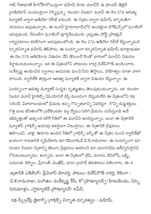 ఈ నెల 27న ‘కలయా నిజామా’ ఆడియో విడుదల