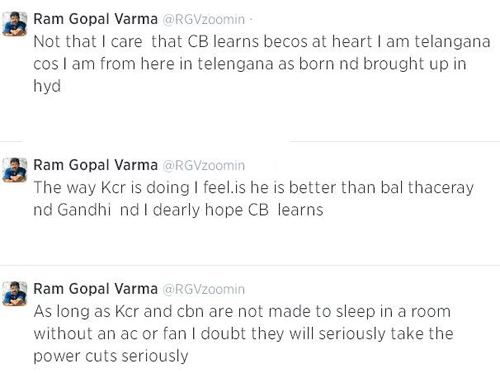 గతంలో ఒకసారి తెలంగాణ ముఖ్యమంత్రి కేసీఆర్ పై వివాదాస్పద వ్యాఖ్యలు చేసి తెలంగాణ ప్రజల ఆగ్రహానికి గురయ్యారు సంచలన దర్శకుడు రామ్ గోపాల్ వర్మ. ఈసారి మాత్రం కేసీఆర్ ను పొగుడుతూ.. ఆంధ్రా ముఖ్యమంత్రి చంద్రబాబును కించపరిచేలా ట్విట్టర్లో తన భావాలను వెల్లడించారు.