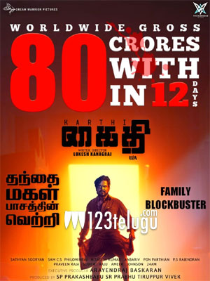 కార్తీక్ ఖైదీ చిత్రం వసూళ్ల పరంపర కొనసాగుతుంది. డొమెస్టిక్ మరియు ఓవర్ సీస్ లో కూడా ఖైదీ మెరుగైన వసూళ్లు రాబడుతుంది. తాజా సమాచారం ప్రకారం ఖైదీ తమిళ వర్షన్ వరల్డ్ వైడ్ గా 80కోట్ల గ్రాస్ కలెక్షన్స్ సాధించింది. ఖైదీ విడుదలైన 12 రోజులకు ఈ మొత్తం వసూళ్లు సాధించి అబ్బురపరిచింది. ఖైదీ చిత్ర బడ్జెట్ మరియు థియరిటికల్ రైట్స్ అమ్మిన రేటుతో పోల్చుకుంటే ఖైదీ బయ్యర్లకు భారీ లాభాలు తెచ్చిపెట్టినట్టే లెక్క. చెన్నై సిటీలో కూడా ఖైదీ వసూళ్లు స్ట్రాంగ్ గా ఉన్నాయి. గత శనివారం 37లక్షల వసూళ్లు సాధించిన ఖైదీ రెండవ శనివారం కూడా 37లక్షల వసూళ్లు సాధించడం విశేషం.
