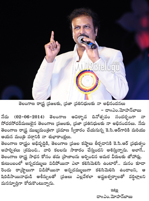 తెలంగాణా ప్రజలకు మోహన్ బాబు అభినందనలు
