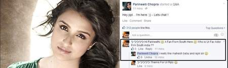 ప్రియాంక చోప్రా కజిన్ గా హిందీ సినిమా ఇండస్ట్రీలో అడుగుపెట్టి తనకంటూ ప్రత్యెక గుర్తింపు తెచ్చుకుంది పరిణితి చోప్రా. పేస్ బుక్ లో అభిమానులతో క్వశ్చన్ & ఆన్సర్ కార్యక్రమం నిర్వహించిన పరిణితి.. సౌత్ సినిమాలలో మీ ఫేవరెట్ హీరో ఎవరు..? అని అడిగిన ప్రశ్నకు ‘మహేష్ బాబు & రజిని సర్’ అంటే నాకు చాలా ఇష్టం అంటూ సమాధానం ఇచ్చింది.