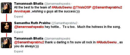 ‘అల్లుడు శీను’ విడుదల సందర్భంగా టీం అందరికి విషెస్ తెలుపుతూ.. తమన్నా ట్వీట్ చేసింది. బదులుగా నువ్వు సాంగ్ లో చాలా హాట్ గా ఉన్నావు అంటూ సమంత కాంప్లిమెంట్ ఇచ్చింది. తర్వాత మిల్కీ బ్యూటీ నువ్వు ఎప్పటిలానే సినిమాలో రాకింగ్ పెర్ఫార్మన్స్ ఇచ్చావు అంటూ సమంతపై తన స్నేహాన్ని చాటుకుంది. ఈ మాటలకు ట్విట్టర్ వేదిక అయ్యింది.