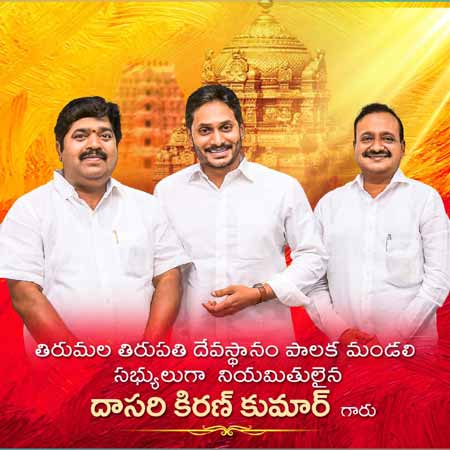 ప్రతిష్ఠాత్మకమైన తిరుమల తిరుపతి దేవస్థానం బోర్డుకు కొత్త సభ్యుడిని నియమిస్తూ ఆంధ్రప్రదేశ్ ప్రభుత్వం ప్రత్యేక జీవో జారీ చేసింది. AP ప్రభుత్వం అన్ని విభాగాలు మరియు రాష్ట్రాలకు ప్రాధాన్యతనిస్తూ బోర్డును జాగ్రత్తగా ఏర్పాటు చేసింది. టీటీడీ బోర్డుకు ఇప్పుడు తెలుగు చిత్ర పరిశ్రమ నుంచి కూడా ప్రాతినిధ్యం ఉంది. 24 మంది సభ్యుల బోర్డు సభ్యుల్లో ఒకరిగా నిర్మాత దాసరి కిరణ్ కుమార్ నియమితులయ్యారు. చాలా మంది బోర్డులో స్థానం సంపాదించడం తమ జీవితకాల ఆశయంగా తీసుకుంటారు. కానీ చాలా కొద్దిమందికి ప్రతిష్టాత్మకమైన అవకాశం లభిస్తుంది.