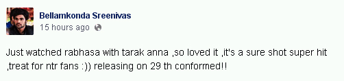 ఇప్పుడే తారక్ అన్నతో కలసి సినిమా చూశాను. సినిమా బాగుంది. గ్యారెంటీ ష్యూర్ షాట్ సూపర్ హిట్ సినిమా. అభిమానులకు పండగే. 29న సినిమా విడుదల అవుతుంది. కన్ఫర్మ్ అంటూ సోషల్ మీడియాలో వెల్లడించారు బెల్లంకొండ సాయి శ్రీనివాస్.
