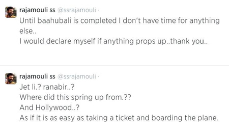 ‘జెట్ లీ..? రణబీర్ కపూర్..? హాలీవుడ్ సినిమా..? ఈ పుకార్లు ఎక్కడ నుండి పుడుతున్నాయో అర్ధం కావడం లేదు. టికెట్ తీసుకుని ఫ్లైట్ ఎక్కినంత సులువుగా చెప్పేస్తున్నారు. ‘బాహుబలి’ సినిమా పూర్తయ్యే వరకు మరో ప్రాజెక్ట్ మీద వర్క్ చేసేంత టైం, ఆలోచించే తీరిక నాకు లేవు. ఏమైనా కొత్త సినిమా విశేషాలు ఉంటె నేనే స్వయంగా వెల్లడిస్తాను. ‘ అంటూ ట్వీట్ చేశారు రాజమౌళి.