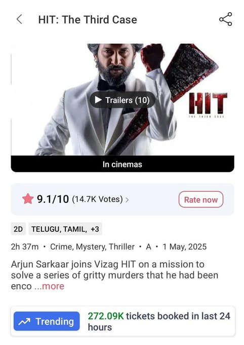 నాని కెరీర్లోనే హైయెస్ట్ గా బుక్ మై షోలో గత 24 గంటల్లో 2 లక్షల 72 వేలకి పైగా టికెట్స్ ఈ సినిమాకి బుక్ అయ్యాయి. ఇక టాక్ కూడా మంచి పాజిటివ్ గా రావడంతో ఈ వీకెండ్ కి భారీ నంబర్స్ ని హిట్ 3 అందుకోవడం ఖాయం అని చెప్పవచ్చు. మరి చూడాలి హిట్ 3 ఎక్కడ వరకు వెళ్లి ఆగుతుందో అనేది. ఇక ఈ చిత్రంలో అడివి శేష్ అలాగే కోలీవుడ్ నటుడు కార్తీ సాలిడ్ క్యామియోలలో కనిపించారు.
