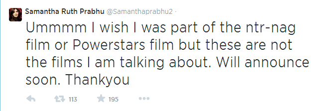 ఈ వార్తలకి సమంత తన ట్విట్టర్ ద్వారా తెరదించింది. ‘ నేను చెప్పిన మల్టీ స్టారర్ ఎన్.టి.ఆర్ – నాగార్జున మూవీ లేదా పవన్ – వెంకటేష్ మూవీ అని అంటున్నారు. కానీ నేను చెప్పిన మల్టీ స్టారర్ మూవీస్ అవి కావు. అసలు సినిమా ఏంటనేది త్వరలో తెలియజేస్తానని’ సమంత ట్వీట్ చేసింది. ప్రస్తుతం సమంత తెలుగులో ‘రభస’, ‘అల్లుడు శీను’, ‘ఆటోనగర్ సూర్య’ సినిమాల్లో నటిస్తుంటే తమిళంలో ‘అంజాన్’, ‘కత్తి’ సినిమాలో నటిస్తోంది.