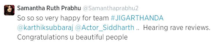 ‘బొమ్మరిల్లు’ హీరో సిద్దార్ధ్ నటించిన తాజా తమిళ సినిమా ‘జిగర్తాండ’ ఈ శుక్రవారం విడుదల అయింది. మ్యూజికల్ గ్యాంగ్ స్టర్ లవ్ స్టొరీగా తెరకెక్కిన ఈ సినిమా విమర్శకుల ప్రసంశలు అందుకుంది. సినిమా విజయం సాదించడం పట్ల ట్విట్టర్లో అనందం వ్యక్తం చేసింది సమంత. అన్నట్లు ఈ సినిమాలో హీరోయిన్ లక్ష్మి మీనన్. మరి సమంత ఎందుకు హ్యాపీగా ఉన్నట్లు అనుకుంటున్నారా..? హీరో సిద్దార్ధ్ కదా..! అందుకు హ్యాపీగా ఉంది. స్నేహితుడి సినిమా హిట్ అయినందుకు కంగ్రాట్స్ తెలిపింది. అంతకు మించి వీరిద్దరి మధ్య ఏం లేదు.
