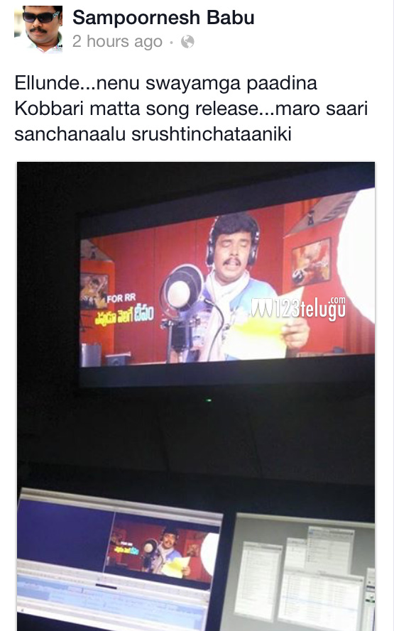 కొబ్బరి మట్ట సినిమాకు గాను సంపూ ఈ పాట పాడారు. ‘ఎపుడూ వెలిగే దీపం..’ అంటూ ఈ పాట సాగనుందని తెలుస్తోంది. ఈ పాటను ఈ బుధవారం రోజున విడుదల చేస్తున్నారు. తాను మొదటి సారి పాట పాడిన విషయాన్ని ఆయన తన ఫేస్బుక్ పేజ్లో పోస్ట్ చేసి తెలియజేశారు. కొబ్బరి మట్ట షూటింగ్ ఇప్పటికే పూర్తి కావచ్చిందని తెలుస్తోంది. ఇక మంచు విష్ణు నిర్మిస్తున్న ‘సింగమ్ 123’లో సంపూ హీరోగా నటిస్తున్న విషయం తెలిసిందే.