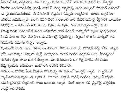 నవంబర్ 6 నుండి నరేష్ తనయుని చిత్రం